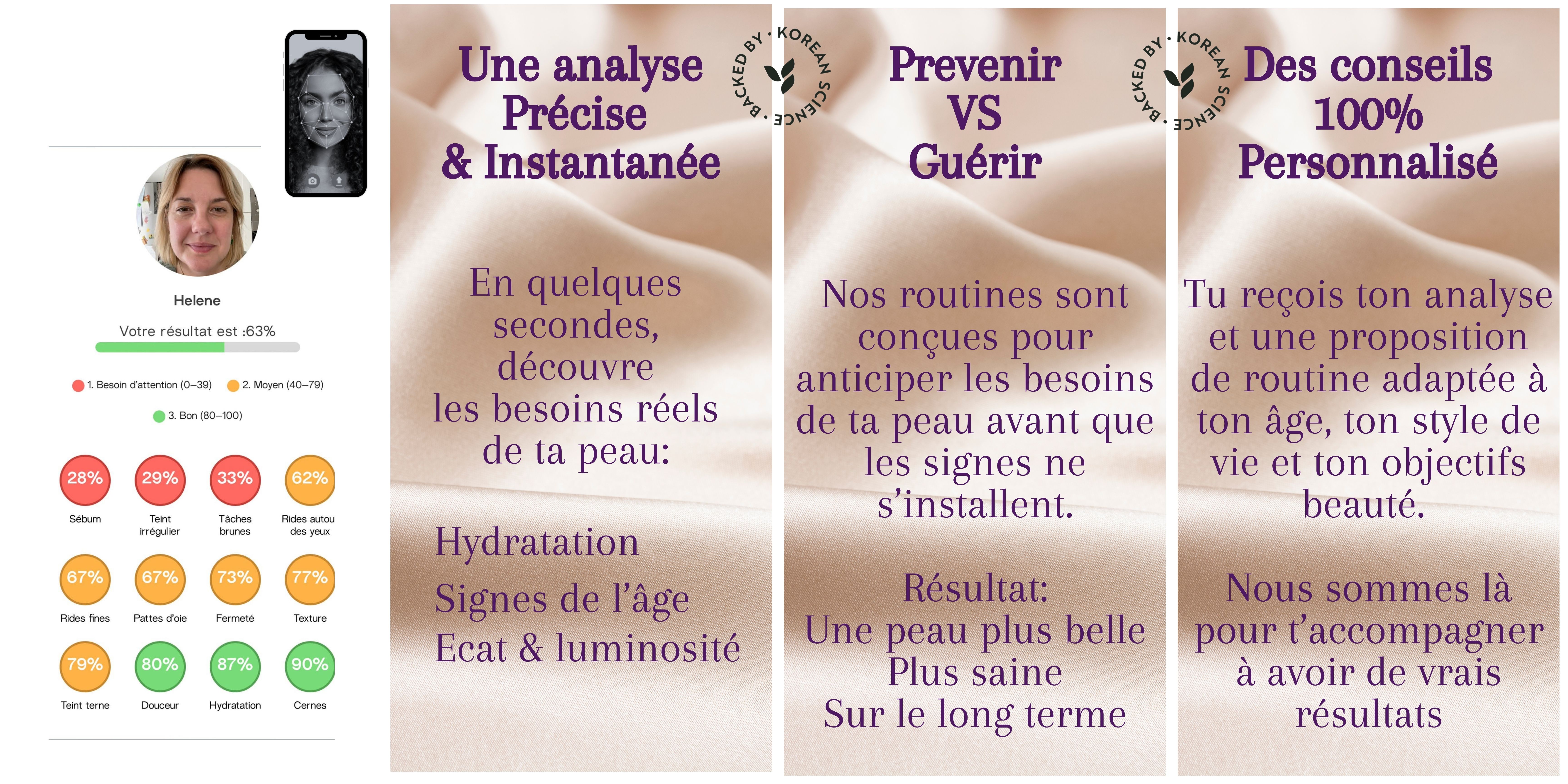 Grâce à notre technologie coréenne exclusive, découvre ton profil beauté et ta routine personnalisée pour une peau lumineuse, équilibrée et en bonne santé.